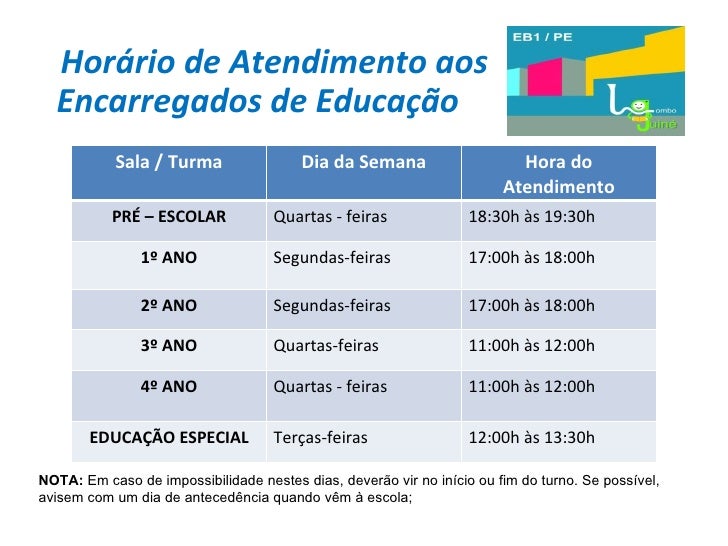 15. 15. Horário de Atendimento aos Encarregados de Educação NOTA: Em caso de impossibilidade nestes dias, deverão vir no início ou fim do turno. Se possível, avisem com um dia de antecedência quando vêm à escola; Sala / Turma Dia da Semana Hora do Atendimento PRÉ – ESCOLAR Quartas - feiras 18:30h às 19:30h 1º ANO Segundas-feiras 17:00h às 18:00h 2º ANO Segundas-feiras 17:00h às 18:00h 3º ANO Quartas-feiras 11:00h às 12:00h 4º ANO Quartas - feiras 11:00h às 12:00h EDUCAÇÃO ESPECIAL Terças-feiras 12:00h às 13:30h