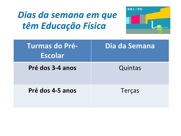 18. 18. Dias da semana em que têm Educação Física Turmas do Pré-Escolar Dia da Semana Pré dos 3-4 anos Quintas Pré dos 4-5 anos Terças