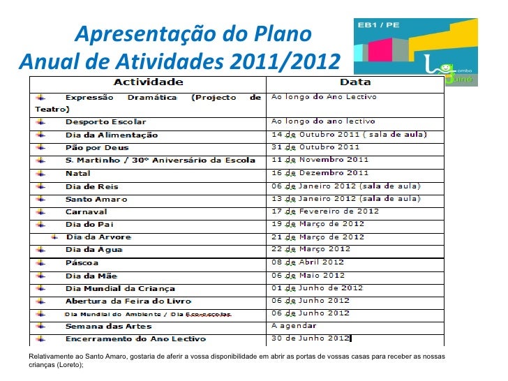 20. 20. Apresentação do Plano Anual de Atividades 2011/2012 Relativamente ao Santo Amaro, gostaria de aferir a vossa disponibilidade em abrir as portas de vossas casas para receber as nossas crianças (Loreto);