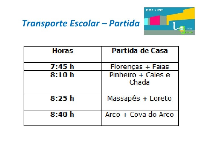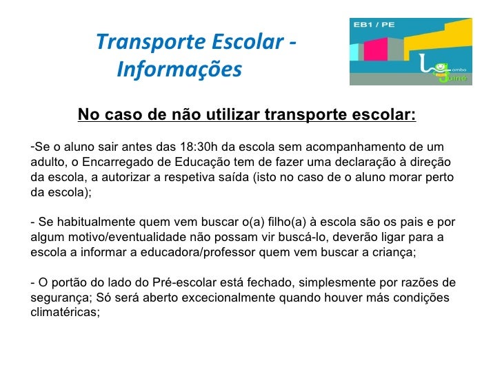 25. 25. Transporte Escolar - Informações <ul><li>No caso de não utilizar transporte escolar: </li></ul><ul><li>Se o aluno sair antes das 18:30h da escola sem acompanhamento de um adulto, o Encarregado de Educação tem de fazer uma declaração à direção da escola, a autorizar a respetiva saída (isto no caso de o aluno morar perto da escola); </li></ul><ul><li>Se habitualmente quem vem buscar o(a) filho(a) à escola são os pais e por algum motivo/eventualidade não possam vir buscá-lo, deverão ligar para a escola a informar a educadora/professor quem vem buscar a criança; </li></ul><ul><li>- O portão do lado do Pré-escolar está fechado, simplesmente por razões de segurança; Só será aberto excecionalmente quando houver más condições climatéricas; </li></ul>