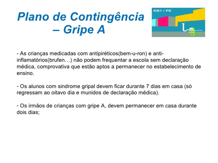 28. 28. Plano de Contingência – Gripe A <ul><li>As crianças medicadas com antipiréticos(bem-u-ron) e anti-inflamatórios(brufen…) não podem frequentar a escola sem declaração médica, comprovativa que estão aptos a permanecer no estabelecimento de ensino. </li></ul><ul><li>Os alunos com sindrome gripal devem ficar durante 7 dias em casa (só regressam ao oitavo dia e munidos de declaração médica). </li></ul><ul><li>Os irmãos de crianças com gripe A, devem permanecer em casa durante dois dias; </li></ul>