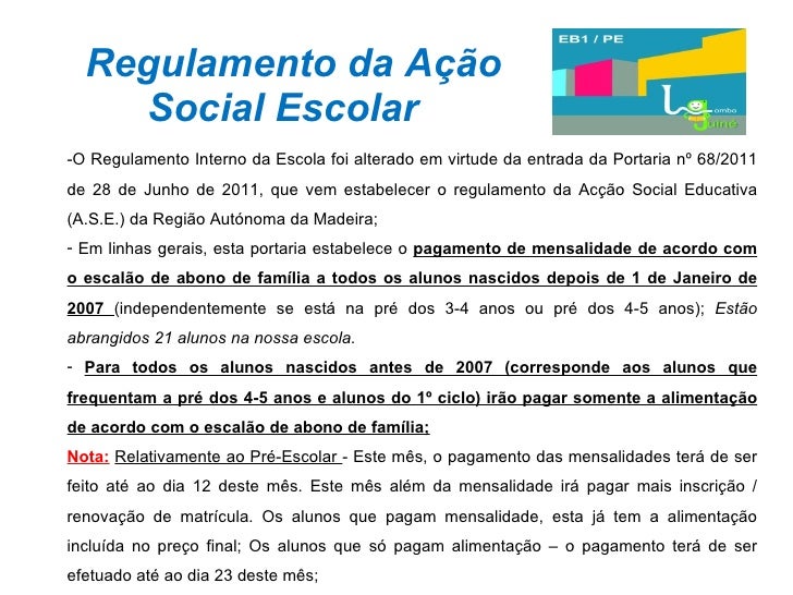 29. 29. Regulamento da Ação Social Escolar <ul><li>O Regulamento Interno da Escola foi alterado em virtude da entrada da Portaria nº 68/2011 de 28 de Junho de 2011, que vem estabelecer o regulamento da Acção Social Educativa (A.S.E.) da Região Autónoma da Madeira; </li></ul><ul><li>Em linhas gerais, esta portaria estabelece o pagamento de mensalidade de acordo com o escalão de abono de família a todos os alunos nascidos depois de 1 de Janeiro de 2007 (independentemente se está na pré dos 3-4 anos ou pré dos 4-5 anos); Estão abrangidos 21 alunos na nossa escola. </li></ul><ul><li>Para todos os alunos nascidos antes de 2007 (corresponde aos alunos que frequentam a pré dos 4-5 anos e alunos do 1º ciclo) irão pagar somente a alimentação de acordo com o escalão de abono de família; </li></ul><ul><li>Nota: Relativamente ao Pré-Escolar - Este mês, o pagamento das mensalidades terá de ser feito até ao dia 12 deste mês. Este mês além da mensalidade irá pagar mais inscrição / renovação de matrícula. Os alunos que pagam mensalidade, esta já tem a alimentação incluída no preço final; Os alunos que só pagam alimentação – o pagamento terá de ser efetuado até ao dia 23 deste mês; </li></ul>