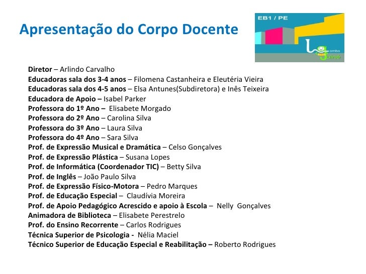 3. 3. Apresentação do Corpo Docente Diretor – Arlindo Carvalho Educadoras sala dos 3-4 anos – Filomena Castanheira e Eleutéria Vieira Educadoras sala dos 4-5 anos – Elsa Antunes(Subdiretora) e Inês Teixeira Educadora de Apoio – Isabel Parker Professora do 1º Ano – Elisabete Morgado Professora do 2º Ano – Carolina Silva Professora do 3º Ano – Laura Silva Professora do 4º Ano – Sara Silva Prof. de Expressão Musical e Dramática – Celso Gonçalves Prof. de Expressão Plástica – Susana Lopes Prof. de Informática (Coordenador TIC) – Betty Silva Prof. de Inglês – João Paulo Silva Prof. de Expressão Físico-Motora – Pedro Marques Prof. de Educação Especial – Claudívia Moreira Prof. de Apoio Pedagógico Acrescido e apoio à Escola – Nelly Gonçalves Animadora de Biblioteca – Elisabete Perestrelo Prof. do Ensino Recorrente – Carlos Rodrigues Técnica Superior de Psicologia - Nélia Maciel Técnico Superior de Educação Especial e Reabilitação – Roberto Rodrigues