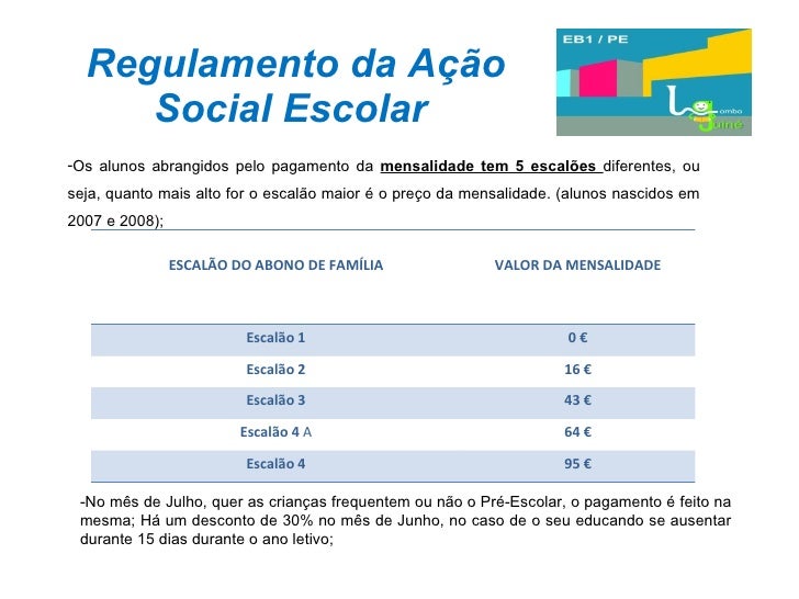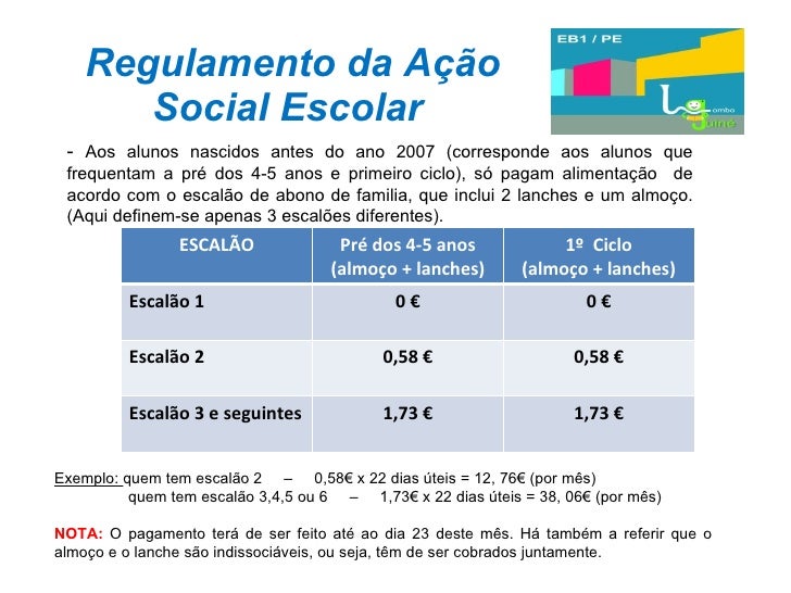 32. 32. Regulamento da Ação Social Escolar - Aos alunos nascidos antes do ano 2007 (corresponde aos alunos que frequentam a pré dos 4-5 anos e primeiro ciclo), só pagam alimentação de acordo com o escalão de abono de familia, que inclui 2 lanches e um almoço. (Aqui definem-se apenas 3 escalões diferentes). Exemplo: quem tem escalão 2 – 0,58€ x 22 dias úteis = 12, 76€ (por mês) quem tem escalão 3,4,5 ou 6 – 1,73€ x 22 dias úteis = 38, 06€ (por mês) NOTA: O pagamento terá de ser feito até ao dia 23 deste mês. Há também a referir que o almoço e o lanche são indissociáveis, ou seja, têm de ser cobrados juntamente. ESCALÃO Pré dos 4-5 anos (almoço + lanches) 1º Ciclo (almoço + lanches) Escalão 1 0 € 0 € Escalão 2 0,58 € 0,58 € Escalão 3 e seguintes 1,73 € 1,73 €