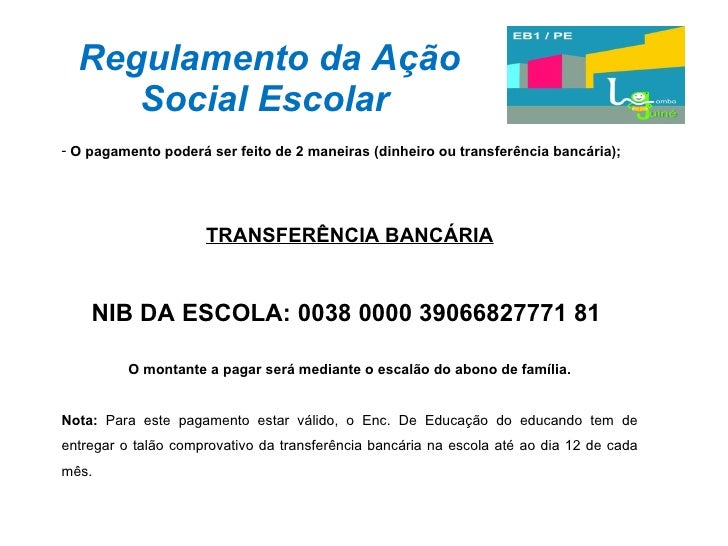 31. 31. Regulamento da Ação Social Escolar <ul><li>O pagamento poderá ser feito de 2 maneiras (dinheiro ou transferência bancária); </li></ul><ul><li>TRANSFERÊNCIA BANCÁRIA </li></ul><ul><li>NIB DA ESCOLA: 0038 0000 39066827771 81 </li></ul><ul><li>O montante a pagar será mediante o escalão do abono de família. </li></ul><ul><li>Nota: Para este pagamento estar válido, o Enc. De Educação do educando tem de entregar o talão comprovativo da transferência bancária na escola até ao dia 12 de cada mês. </li></ul>