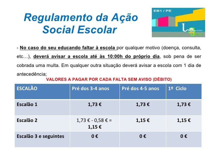 33. 33. Regulamento da Ação Social Escolar - No caso do seu educando faltar à escola por qualquer motivo (doença, consulta, etc…), deverá avisar a escola até às 10:00h do próprio dia , sob pena de ser cobrada uma multa. Em qualquer outra situação deverá avisar a escola com 1 dia de antecedência; VALORES A PAGAR POR CADA FALTA SEM AVISO (DÉBITO) ESCALÃO Pré dos 3-4 anos Pré dos 4-5 anos 1º Ciclo Escalão 1 1,73 € 1,73 € 1,73 € Escalão 2 1,73 € - 0,58 € = 1,15 € 1,15 € 1,15 € Escalão 3 e seguintes 0 € 0 € 0 €
