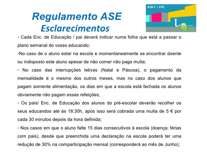 36. 36. Regulamento ASE Esclarecimentos <ul><li>Cada Enc. de Educação / pai deverá indicar numa folha que está a passar o plano semanal do vosso educando; </li></ul><ul><li>No caso de o aluno estar na escola e momentaneamente se encontrar doente ou indisposto este aluno apesar de não comer não paga multa; </li></ul><ul><li>No caso das interrupções letivas (Natal e Páscoa), o pagamento da mensalidade é o mesmo dos outros meses, mas no caso dos alunos que pagam somente alimentação, os dias em que a escola está fechada os alunos obviamente não pagam essas refeições; </li></ul><ul><li>Os pais/ Enc. de Educação dos alunos do pré-escolar deverão recolher os seus educandos até às 18:30h, após isso será cobrada uma multa de 5 € por cada 30 minutos depois da hora definida; </li></ul><ul><li>Nos casos em que o aluno falte 15 dias consecutivos à escola (doença; férias com pais), desde que preenchida uma declaração na escola poderá ter uma redução de 30% na comparticipação mensal (corresponderá ao mês de Junho); </li></ul>