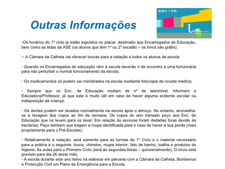 37. 37. Outras Informações <ul><li>Os horários do 1º ciclo já estão expostos no placar, destinado aos Encarregados de Educação, bem como as listas da ASE (os alunos que têm 1º ou 2º escalão – os livros são grátis); </li></ul><ul><li>- A Câmara da Calheta vai oferecer toucas para a natação a todos os alunos da escola; </li></ul><ul><li>Quando os Encarregados de educação vêm à escola deverão ir de encontro a uma funcionária para não perturbar o normal funcionamento da escola; </li></ul><ul><li>Os medicamentos só podem ser ministrados na escola mediante fotocópia da receita médica; </li></ul><ul><li>Sempre que os Enc. de Educação mudam de nº de telemóvel, informem a Educadora/Professor, já que este é muito útil em caso de haver alguma acidente escolar ou indisposição da criança; </li></ul><ul><li>Os dentes podem ser lavados normalmente na escola após o almoço. No entanto, aconselha-se a lavagem dos copos ao fim de semana; Os copos do ano transato peço aos Enc. de Educação que os levem para os lavar; Em relação às escovas foram deitadas foras devido às bactérias; Peço também que tragam a roupa identificada para o caso de haver a sua perda (mais propriamente para o Pré-Escolar); </li></ul><ul><li>Relativamente à natação, será somente para as turmas de 1º Ciclo e o material necessário para a prática é o seguinte: touca, chinelos, roupa interior, fato de banho, toalha e produtos de higiene; As aulas para o Primeiro Ciclo (será às segundas-feiras – quinzenalmente); O inicio está previsto para dia 26 deste mês; </li></ul><ul><li>- A escola durante este ano letivo irá elaborar em parceria com a Câmara da Calheta, Bombeiros e Protecção Civil um Plano de Emergência para a Escola; </li></ul>