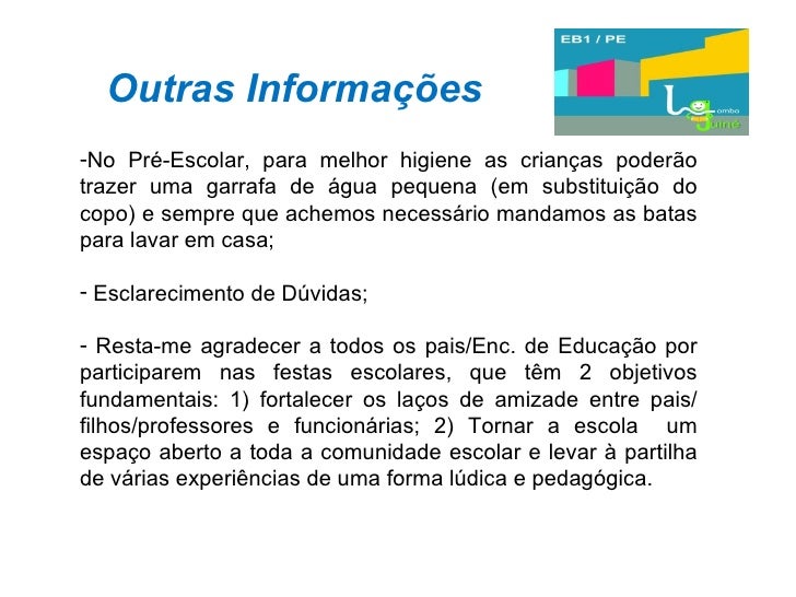 38. 38. Outras Informações <ul><li>No Pré-Escolar, para melhor higiene as crianças poderão trazer uma garrafa de água pequena (em substituição do copo) e sempre que achemos necessário mandamos as batas para lavar em casa; </li></ul><ul><li>Esclarecimento de Dúvidas; </li></ul><ul><li>Resta-me agradecer a todos os pais/Enc. de Educação por participarem nas festas escolares, que têm 2 objetivos fundamentais: 1) fortalecer os laços de amizade entre pais/ filhos/professores e funcionárias; 2) Tornar a escola um espaço aberto a toda a comunidade escolar e levar à partilha de várias experiências de uma forma lúdica e pedagógica. </li></ul>