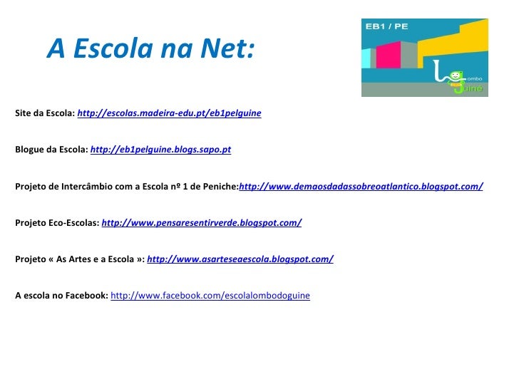 6. 6. A Escola na Net: Site da Escola: http://escolas.madeira-edu.pt/eb1pelguine Blogue da Escola: http://eb1pelguine.blogs.sapo.pt Projeto de Intercâmbio com a Escola nº 1 de Peniche: http://www.demaosdadassobreoatlantico.blogspot.com/ Projeto Eco-Escolas: http://www.pensaresentirverde.blogspot.com/ Projeto « As Artes e a Escola »: http://www.asarteseaescola.blogspot.com/ A escola no Facebook: http://www.facebook.com/escolalombodoguine