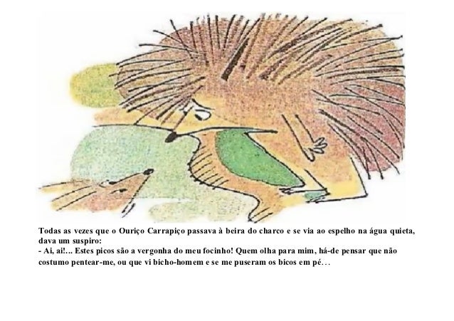 2. 2. Todas as vezes que o Ouriço Carrapiço passava à beira do charco e se via ao espelho na água quieta,dava um suspiro:- Ai, ai!... Estes picos são a vergonha do meu focinho! Quem olha para mim, há-de pensar que nãocostumo pentear-me, ou que vi bicho-homem e se me puseram os bicos em pé…