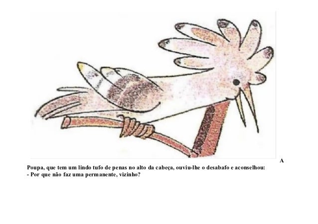 3. 3. APoupa, que tem um lindo tufo de penas no alto da cabeça, ouviu-lhe o desabafo e aconselhou:- Por que não faz uma permanente, vizinho?