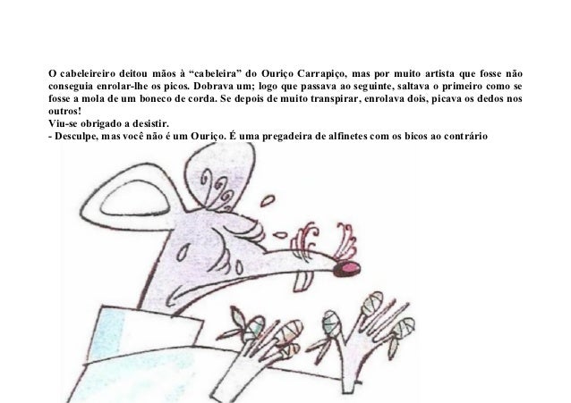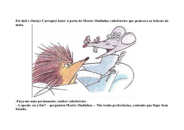 4. 4. Foi dali o Ouriço Carrapiço bater à porta do Mestre Ondinhas cabeleireiro que penteava as belezas damata.-Faça-me uma permanente, senhor cabeleireiro.- A quente ou a frio? – perguntou Mestre Ondinhas. – Não tenho preferências, contanto que fique bemfrisado.
