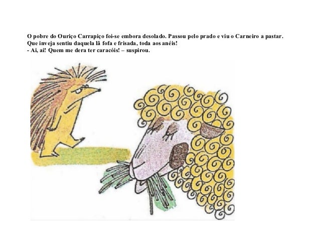 6. 6. O pobre do Ouriço Carrapiço foi-se embora desolado. Passou pelo prado e viu o Carneiro a pastar.Que inveja sentiu daquela lã fofa e frisada, toda aos anéis!- Ai, ai! Quem me dera ter caracóis! – suspirou.