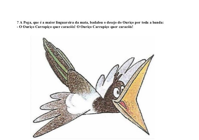 7. 7. ? A Pega, que é a maior linguareira da mata, badalou o desejo do Ouriço por toda a banda:- O Ouriço Carrapiço quer caracóis! O Ouriço Carrapiço quer caracóis!