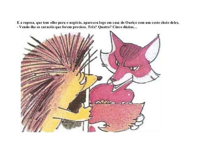 8. 8. E a raposa, que tem olho para o negócio, apareceu logo em casa do Ouriço com um cesto cheio deles.- Vendo-lhe os caracóis que forem precisos. Três? Quatro? Cinco dúzias…