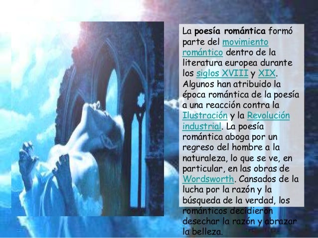 10. 10. La poesía romántica formóparte del movimientoromántico dentro de laliteratura europea durantelos siglos XVIII y XIX.Algunos han atribuido laépoca romántica de la poesíaa una reacción contra laIlustración y la Revoluciónindustrial. La poesíaromántica aboga por unregreso del hombre a lanaturaleza, lo que se ve, enparticular, en las obras deWordsworth. Cansados de lalucha por la razón y labúsqueda de la verdad, losrománticos decidierondesechar la razón y abrazarla belleza.