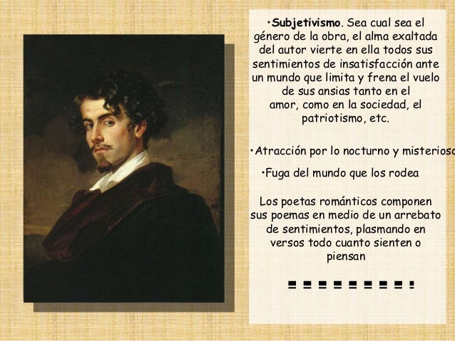11. 11. •Subjetivismo. Sea cual sea elgénero de la obra, el alma exaltada del autor vierte en ella todos sussentimientos de insatisfacción anteun mundo que limita y frena el vuelo de sus ansias tanto en el amor, como en la sociedad, el patriotismo, etc.•Atracción por lo nocturno y misterioso •Fuga del mundo que los rodea Los poetas románticos componensus poemas en medio de un arrebato de sentimientos, plasmando en versos todo cuanto sienten o piensan
