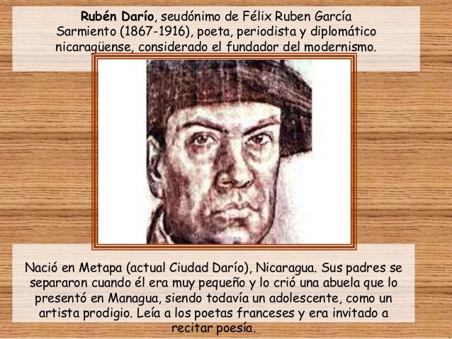 12. 12. Rubén Darío, seudónimo de Félix Ruben García Sarmiento (1867-1916), poeta, periodista y diplomático nicaragüense, considerado el fundador del modernismo.Nació en Metapa (actual Ciudad Darío), Nicaragua. Sus padres sesepararon cuando él era muy pequeño y lo crió una abuela que lo presentó en Managua, siendo todavía un adolescente, como un artista prodigio. Leía a los poetas franceses y era invitado a recitar poesía.
