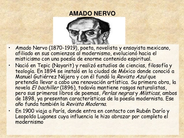 13. 13. AMADO NERVO• Amado Nervo (1870-1919), poeta, novelista y ensayista mexicano, afiliado en sus comienzos al modernismo, evolucionó hacia el misticismo con una poesía de enorme contenido espiritual.• Nació en Tepic (Nayarit) y realizó estudios de ciencias, filosofía y teología. En 1894 se instaló en la ciudad de México donde conoció a Manuel Gutiérrez Nájera y con él fundó la Revista Azul que pretendía llevar a cabo una renovación artística. Su primera obra, la novela El bachiller (1896), todavía mantiene rasgos naturalistas, pero sus primeros libros de poemas, Perlas negras y Místicas, ambos de 1898, ya presentan características de la poesía modernista. Ese año funda también la Revista Moderna.• En 1900 viaja a París, donde entra en contacto con Rubén Darío y Leopoldo Lugones cuya influencia le hizo abrazar por completo el modernismo