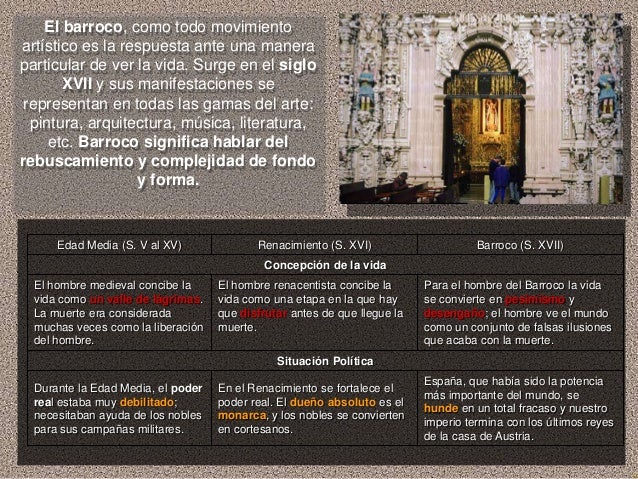 2. 2. El barroco, como todo movimientoartístico es la respuesta ante una maneraparticular de ver la vida. Surge en el siglo XVII y sus manifestaciones se representan en todas las gamas del arte: pintura, arquitectura, música, literatura, etc. Barroco significa hablar delrebuscamiento y complejidad de fondo y forma. Edad Media (S. V al XV) Renacimiento (S. XVI) Barroco (S. XVII) Concepción de la vida El hombre medieval concibe la El hombre renacentista concibe la Para el hombre del Barroco la vida vida como un valle de lágrimas. vida como una etapa en la que hay se convierte en pesimismo y La muerte era considerada que disfrutar antes de que llegue la desengaño; el hombre ve el mundo muchas veces como la liberación muerte. como un conjunto de falsas ilusiones del hombre. que acaba con la muerte. Situación Política España, que había sido la potencia Durante la Edad Media, el poder En el Renacimiento se fortalece el más importante del mundo, se real estaba muy debilitado; poder real. El dueño absoluto es el hunde en un total fracaso y nuestro necesitaban ayuda de los nobles monarca, y los nobles se convierten imperio termina con los últimos reyes para sus campañas militares. en cortesanos. de la casa de Austria.