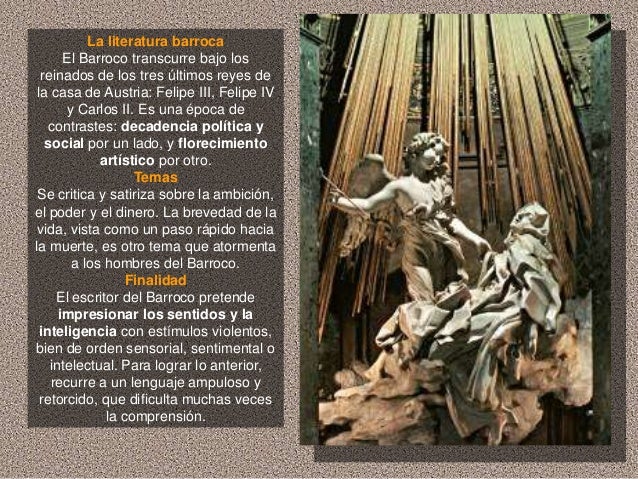 3. 3. La literatura barroca El Barroco transcurre bajo los reinados de los tres últimos reyes de la casa de Austria: Felipe III, Felipe IV y Carlos II. Es una época de contrastes: decadencia política y social por un lado, y florecimiento artístico por otro. Temas Se critica y satiriza sobre la ambición,el poder y el dinero. La brevedad de la vida, vista como un paso rápido haciala muerte, es otro tema que atormenta a los hombres del Barroco. Finalidad El escritor del Barroco pretende impresionar los sentidos y la inteligencia con estímulos violentos,bien de orden sensorial, sentimental o intelectual. Para lograr lo anterior, recurre a un lenguaje ampuloso y retorcido, que dificulta muchas veces la comprensión.