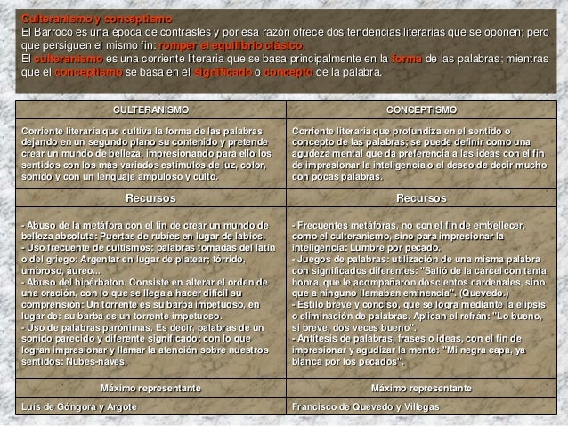 4. 4. Culteranismo y conceptismoEl Barroco es una época de contrastes y por esa razón ofrece dos tendencias literarias que se oponen; peroque persiguen el mismo fin: romper el equilibrio clásico.El culteranismo es una corriente literaria que se basa principalmente en la forma de las palabras; mientrasque el conceptismo se basa en el significado o concepto de la palabra. CULTERANISMO CONCEPTISMOCorriente literaria que cultiva la forma de las palabras Corriente literaria que profundiza en el sentido odejando en un segundo plano su contenido y pretende concepto de las palabras; se puede definir como unacrear un mundo de belleza, impresionando para ello los agudeza mental que da preferencia a las ideas con el finsentidos con los más variados estímulos de luz, color, de impresionar la inteligencia o el deseo de decir muchosonido y con un lenguaje ampuloso y culto. con pocas palabras. Recursos Recursos- Abuso de la metáfora con el fin de crear un mundo de - Frecuentes metáforas, no con el fin de embellecer,belleza absoluta: Puertas de rubíes en lugar de labios. como el culteranismo, sino para impresionar la- Uso frecuente de cultismos: palabras tomadas del latín inteligencia: Lumbre por pecado.o del griego: Argentar en lugar de platear; tórrido, - Juegos de palabras: utilización de una misma palabraumbroso, áureo... con significados diferentes: "Salió de la cárcel con tanta- Abuso del hipérbaton. Consiste en alterar el orden de honra, que le acompañaron doscientos cardenales, sinouna oración, con lo que se llega a hacer difícil su que a ninguno llamaban eminencia". (Quevedo.)comprensión: Un torrente es su barba impetuoso, en - Estilo breve y conciso, que se logra mediante la elipsislugar de: su barba es un torrente impetuoso. o eliminación de palabras. Aplican el refrán: "Lo bueno,- Uso de palabras parónimas. Es decir, palabras de un si breve, dos veces bueno".sonido parecido y diferente significado; con lo que - Antítesis de palabras, frases o ideas, con el fin delogran impresionar y llamar la atención sobre nuestros impresionar y agudizar la mente: "Mi negra capa, yasentidos: Nubes-naves. blanca por los pecados". Máximo representante Máximo representanteLuís de Góngora y Argote Francisco de Quevedo y Villegas