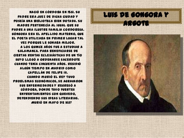 5. 5. Nació en Córdoba en 1561. Su padre era juez de dicha ciudad y Luis de Gongora y poseía una biblioteca bien dotada. Su madre pertenecía al igual que su Argotepadre a una ilustre familia cordobesa.Góngora era el apellido materno, queel poeta utilizaba en primer lugar tal vez porque le sonaba mejor. A los quince años fue a estudiar a Salamanca. Para beneficiarse de ciertas rentas eclesiásticas de un tío suyo llegó a ordenarse sacerdote cuando tenía cincuenta años. Residió algún tiempo en Madrid como capellán de Felipe III. Cuando murió el rey tuvo problemas económicos, se agravaron sus enfermedades y regresó a Córdoba, donde tuvo fuertes enfrentamientos con Quevedo, defendiendo sus ideas literarias. Murió en mayo de 1627