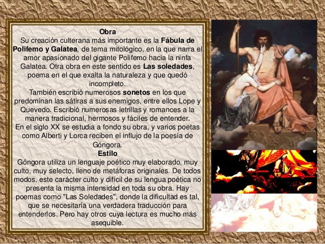 6. 6. Obra Su creación culterana más importante es la Fábula dePolifemo y Galatea, de tema mitológico, en la que narra el amor apasionado del gigante Polifemo hacia la ninfa Galatea. Otra obra en este sentido es Las soledades, poema en el que exalta la naturaleza y que quedó incompleto. También escribió numerosos sonetos en los quepredominan las sátiras a sus enemigos, entre ellos Lope y Quevedo. Escribió numerosas letrillas y romances a la manera tradicional, hermosos y fáciles de entender. En el siglo XX se estudia a fondo su obra, y varios poetas como Alberti y Lorca reciben el influjo de la poesía de Góngora. Estilo Góngora utiliza un lenguaje poético muy elaborado, muyculto, muy selecto, lleno de metáforas originales. De todosmodos, este carácter culto y difícil de su lengua poética no presenta la misma intensidad en toda su obra. Hay poemas como "Las Soledades", donde la dificultad es tal, que se necesitaría una verdadera traducción para entenderlos. Pero hay otros cuya lectura es mucho más asequible.