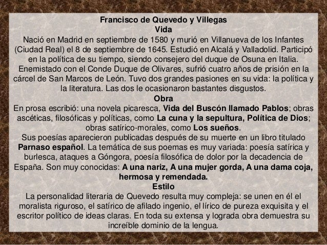 7. 7. Francisco de Quevedo y Villegas Vida Nació en Madrid en septiembre de 1580 y murió en Villanueva de los Infantes(Ciudad Real) el 8 de septiembre de 1645. Estudió en Alcalá y Valladolid. Participó en la política de su tiempo, siendo consejero del duque de Osuna en Italia. Enemistado con el Conde Duque de Olivares, sufrió cuatro años de prisión en lacárcel de San Marcos de León. Tuvo dos grandes pasiones en su vida: la política y la literatura. Las dos le ocasionaron bastantes disgustos. ObraEn prosa escribió: una novela picaresca, Vida del Buscón llamado Pablos; obras ascéticas, filosóficas y políticas, como La cuna y la sepultura, Política de Dios; obras satírico-morales, como Los sueños. Sus poesías aparecieron publicadas después de su muerte en un libro titulado Parnaso español. La temática de sus poemas es muy variada: poesía satírica y burlesca, ataques a Góngora, poesía filosófica de dolor por la decadencia deEspaña. Son muy conocidas: A una nariz, A una mujer gorda, A una dama coja, hermosa y remendada. Estilo La personalidad literaria de Quevedo resulta muy compleja: se unen en él el moralista riguroso, el satírico de afilado ingenio, el lírico de pureza exquisita y el escritor político de ideas claras. En toda su extensa y lograda obra demuestra su increíble dominio de la lengua.