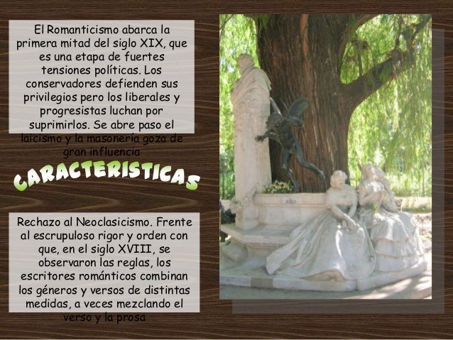 8. 8. El Romanticismo abarca laprimera mitad del siglo XIX, que es una etapa de fuertes tensiones políticas. Los conservadores defienden sus privilegios pero los liberales y progresistas luchan por suprimirlos. Se abre paso el laicismo y la masonería goza de gran influenciaRechazo al Neoclasicismo. Frente al escrupuloso rigor y orden con que, en el siglo XVIII, se observaron las reglas, los escritores románticos combinanlos géneros y versos de distintas medidas, a veces mezclando el verso y la prosa