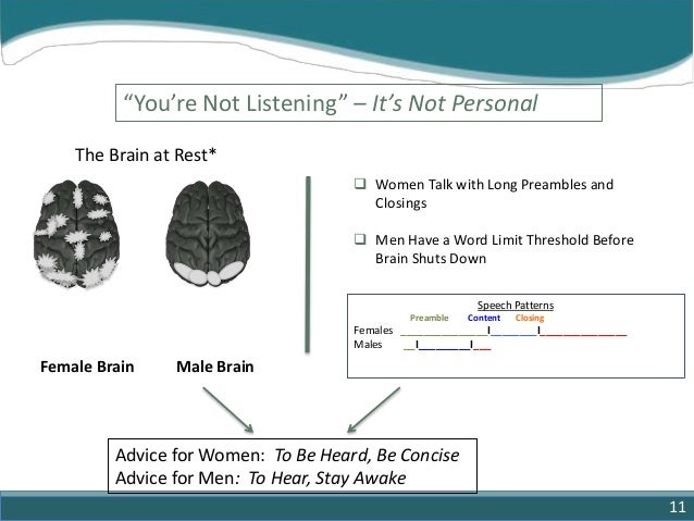 11. 11. “You’re Not Listening” – It’s Not Personal The Brain at Rest* Female Brain Male Brain  Women Talk with Long Preambles and Closings  Men Have a Word Limit Threshold Before Brain Shuts Down Speech Patterns Preamble Content Closing Females _______________I________I_______________ Males __I_________I___ Advice for Women: To Be Heard, Be Concise Advice for Men: To Hear, Stay Awake 11