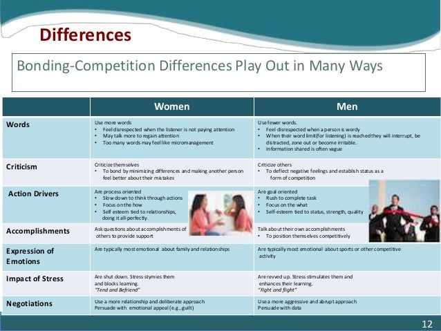 12. 12. Women Men Words Use more words • Feel disrespected when the listener is not paying attention • May talk more to regain attention • Too many words may feel like micromanagement Use fewer words. • Feel disrespected when a person is wordy • When their word limit(for listening) is reached they will interrupt, be distracted, zone out or become irritable. • Information shared is often vague Criticism Criticize themselves • To bond by minimizing differences and making another person feel better about their mistakes Criticize others • To deflect negative feelings and establish status as a form of competition Action Drivers Are process oriented • Slow down to think through actions • Focus on the how • Self esteem tied to relationships, doing it all-perfectly. Are goal oriented • Rush to complete task • Focus on the what • Self-esteem tied to status, strength, quality Accomplishments Ask questions about accomplishments of others to provide support Talk about their own accomplishments • To position themselves competitively Expression of Emotions Are typically most emotional about family and relationships Are typically most emotional about sports or other competitive activity Impact of Stress Are shut down. Stress stymies them and blocks learning. “Tend and Befriend” Are revved up. Stress stimulates them and enhances their learning. “Fight and flight” Negotiations Use a more relationship and deliberate approach Persuade with emotional appeal (e.g., guilt) Use a more aggressive and abrupt approach Persuade with data Differences Bonding-Competition Differences Play Out in Many Ways 12