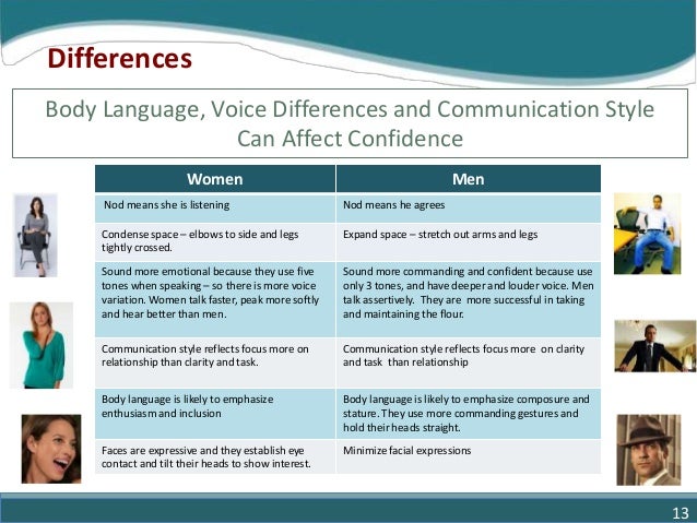13. 13. Body Language, Voice Differences and Communication Style Can Affect Confidence Women Men Nod means she is listening Nod means he agrees Condense space – elbows to side and legs tightly crossed. Expand space – stretch out arms and legs Sound more emotional because they use five tones when speaking – so there is more voice variation. Women talk faster, peak more softly and hear better than men. Sound more commanding and confident because use only 3 tones, and have deeper and louder voice. Men talk assertively. They are more successful in taking and maintaining the flour. Communication style reflects focus more on relationship than clarity and task. Communication style reflects focus more on clarity and task than relationship Body language is likely to emphasize enthusiasm and inclusion Body language is likely to emphasize composure and stature. They use more commanding gestures and hold their heads straight. Faces are expressive and they establish eye contact and tilt their heads to show interest. Minimize facial expressions Differences 13