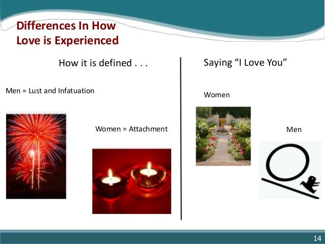 14. 14. How it is defined . . . Differences In How Love is Experienced Saying “I Love You” Women MenWomen = Attachment Men = Lust and Infatuation 14