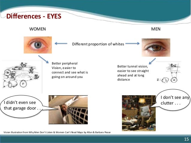 15. 15. Differences - EYES MENWOMEN I don’t see any clutter . . .I didn’t even see that garage door . . . Different proportion of whites Better peripheral Vision, easier to connect and see what is going on around you Better tunnel vision, easier to see straight ahead and at long distance Vision illustration from Why Men Don’t Listen & Women Can’t Read Maps by Allan & Barbara Pease 15