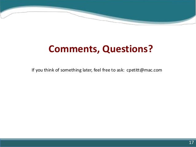 17. 17. Comments, Questions? 17 If you think of something later, feel free to ask: cpetitt@mac.com