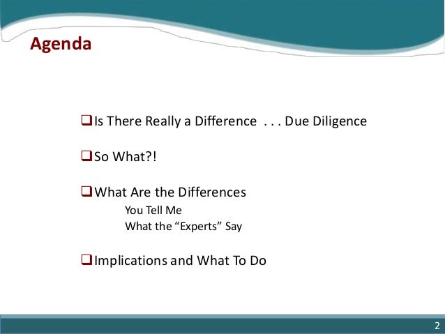 2. 2. Agenda Is There Really a Difference . . . Due Diligence So What?! What Are the Differences You Tell Me What the “Experts” Say Implications and What To Do 2