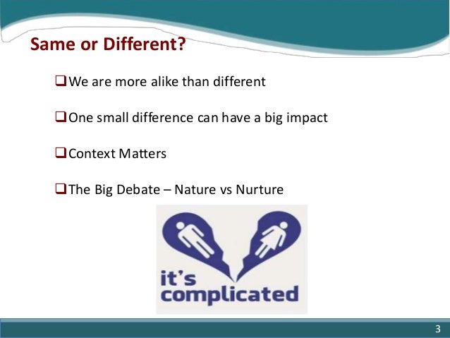 3. 3. Same or Different? We are more alike than different One small difference can have a big impact Context Matters The Big Debate – Nature vs Nurture 3