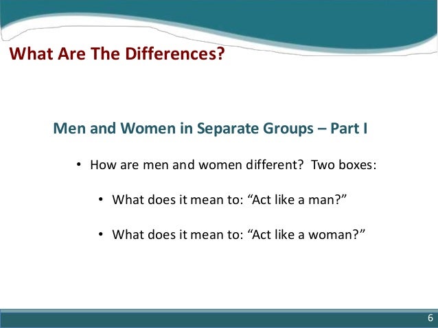 6. 6. Men and Women in Separate Groups – Part I What Are The Differences? • How are men and women different? Two boxes: • What does it mean to: “Act like a man?” • What does it mean to: “Act like a woman?” 6