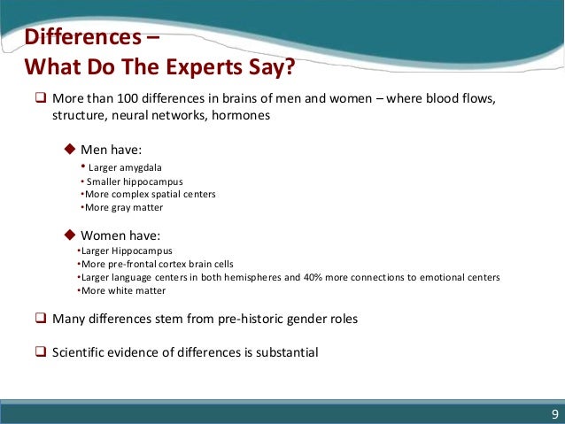 9. 9. Differences – What Do The Experts Say?  More than 100 differences in brains of men and women – where blood flows, structure, neural networks, hormones  Men have: • Larger amygdala • Smaller hippocampus •More complex spatial centers •More gray matter  Women have: •Larger Hippocampus •More pre-frontal cortex brain cells •Larger language centers in both hemispheres and 40% more connections to emotional centers •More white matter  Many differences stem from pre-historic gender roles  Scientific evidence of differences is substantial 9