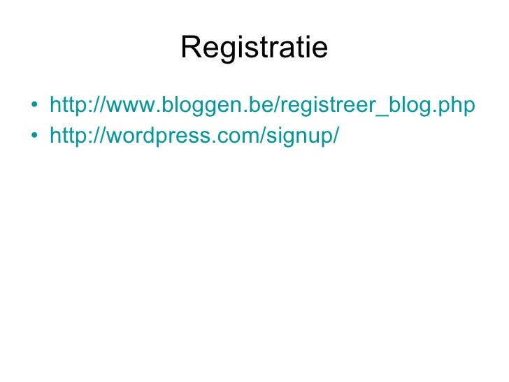 2. 4. Registratie <ul><li>http://www.bloggen.be/registreer_blog.php </li></ul><ul><li>http://wordpress.com/signup/ </li></ul>