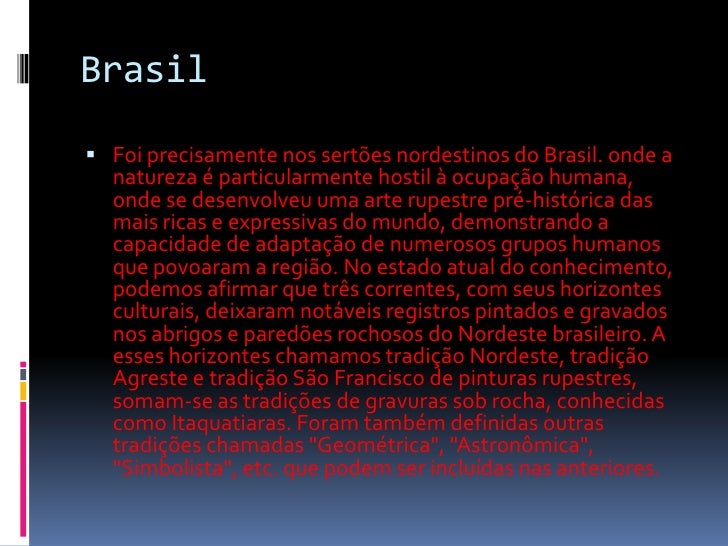10. 10. Brasil<br />Foi precisamente nos sertões nordestinos do Brasil. onde a natureza é particularmente hostil à ocupação humana, onde se desenvolveu uma arte rupestre pré-histórica das mais ricas e expressivas do mundo, demonstrando a capacidade de adaptação de numerosos grupos humanos que povoaram a região. No estado atual do conhecimento, podemos afirmar que três correntes, com seus horizontes culturais, deixaram notáveis registros pintados e gravados nos abrigos e paredões rochosos do Nordeste brasileiro. A esses horizontes chamamos tradição Nordeste, tradição Agreste e tradição São Francisco de pinturas rupestres, somam-se as tradições de gravuras sob rocha, conhecidas como Itaquatiaras. Foram também definidas outras tradições chamadas "Geométrica", "Astronômica", "Simbolista", etc. que podem ser incluídas nas anteriores. <br />