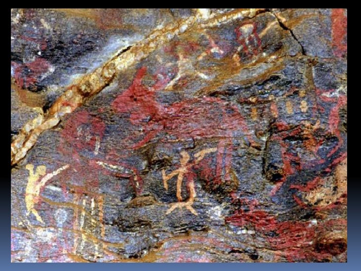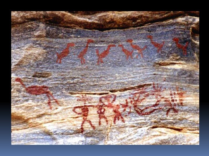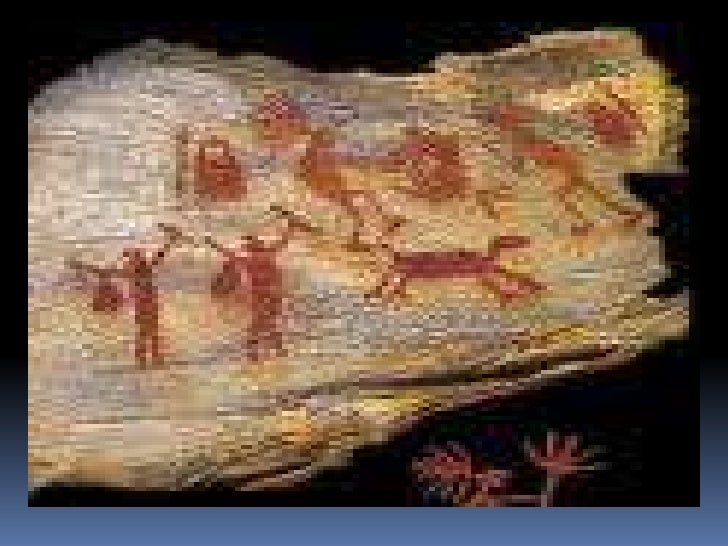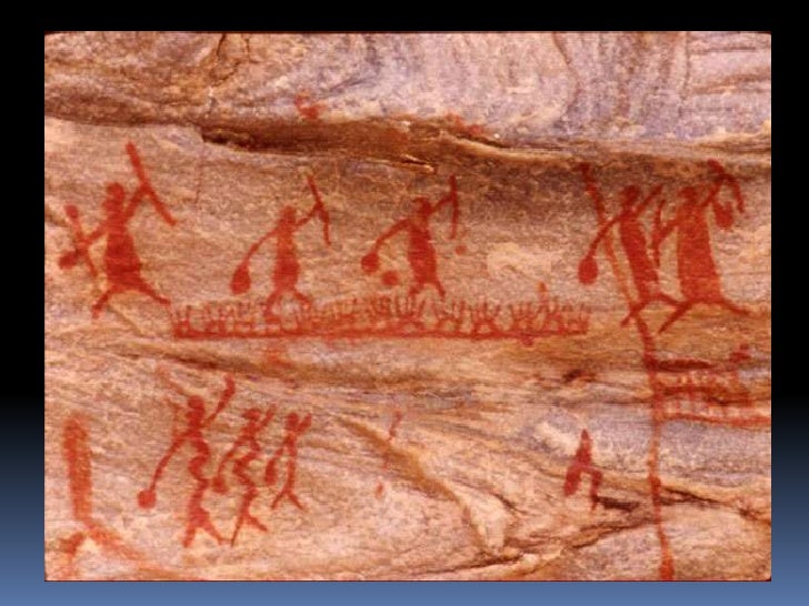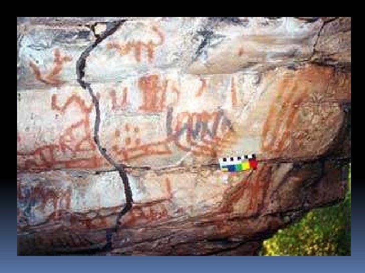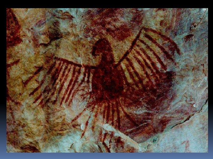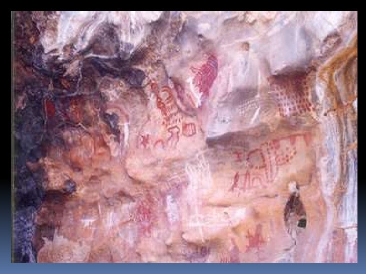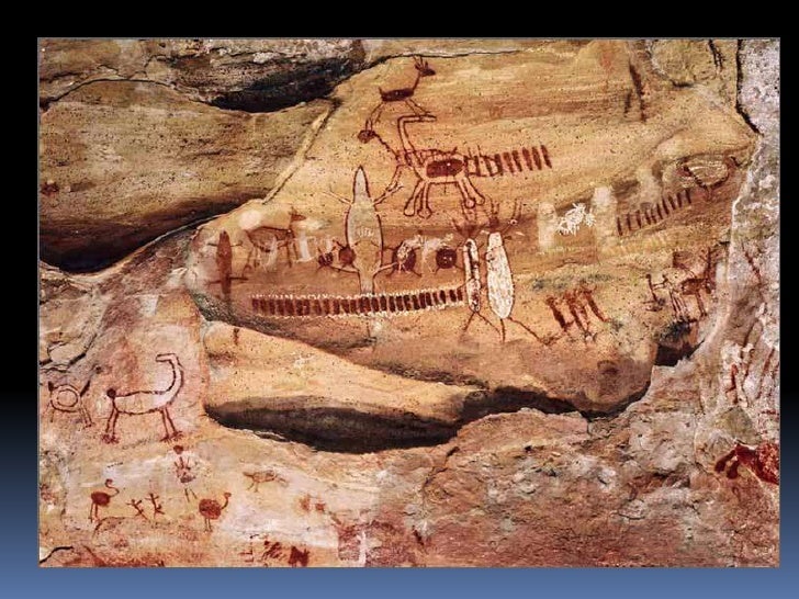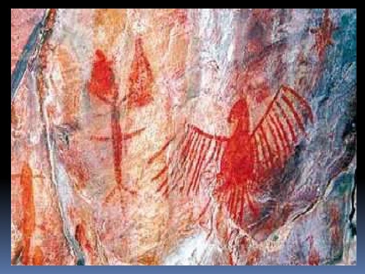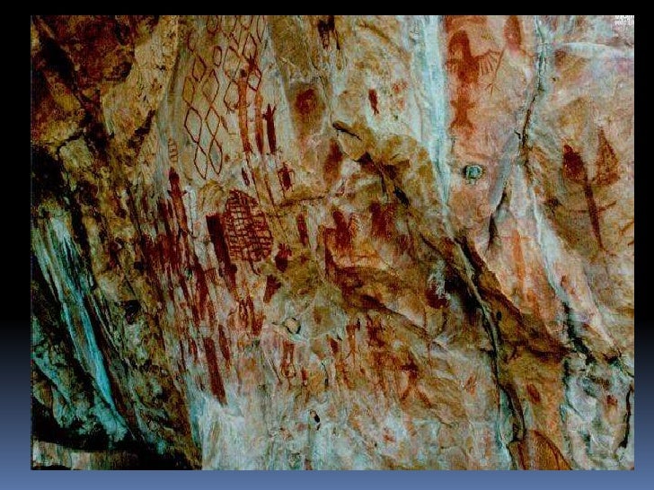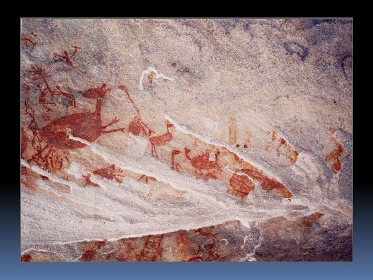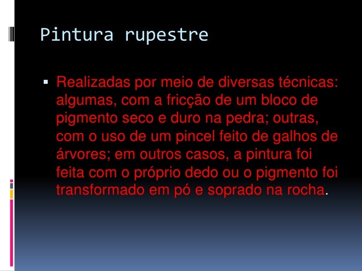 6. 6. Pintura rupestre<br />Realizadas por meio de diversas técnicas: algumas, com a fricção de um bloco de pigmento seco e duro na pedra; outras, com o uso de um pincel feito de galhos de árvores; em outros casos, a pintura foi feita com o próprio dedo ou o pigmento foi transformado em pó e soprado na rocha.<br />