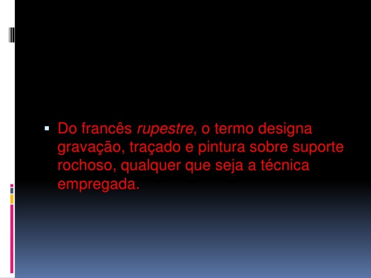 2. 2. Do francês rupestre, o termo designa gravação, traçado e pintura sobre suporte rochoso, qualquer que seja a técnica empregada. <br />