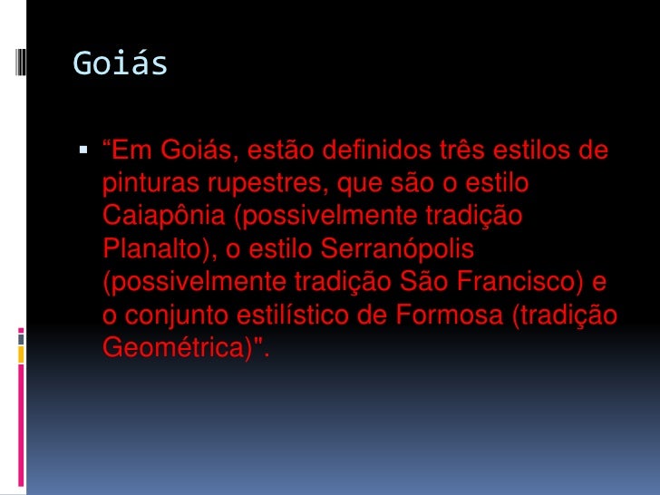 27. 27. Goiás<br />“Em Goiás, estão definidos três estilos de pinturas rupestres, que são o estilo Caiapônia (possivelmente tradição Planalto), o estilo Serranópolis (possivelmente tradição São Francisco) e o conjunto estilístico de Formosa (tradição Geométrica)". <br />