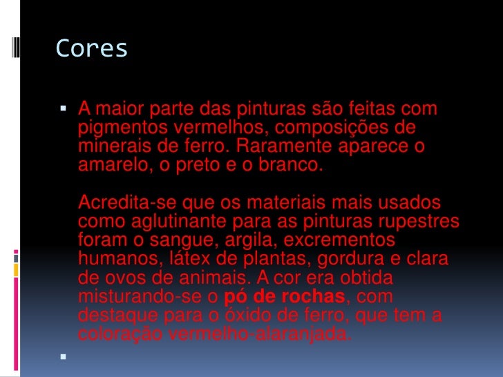 33. 33. Cores<br />A maior parte das pinturas são feitas com pigmentos vermelhos, composições de minerais de ferro. Raramente aparece o amarelo, o preto e o branco. Acredita-se que os materiais mais usados como aglutinante para as pinturas rupestres foram o sangue, argila, excrementos humanos, látex de plantas, gordura e clara de ovos de animais. A cor era obtida misturando-se o pó de rochas, com destaque para o óxido de ferro, que tem a coloração vermelho-alaranjada. <br />