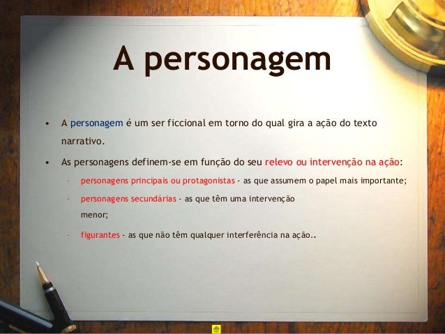 10. 10. A personagem • A personagem é um ser ficcional em torno do qual gira a ação do texto narrativo. • As personagens definem-se em função do seu relevo ou intervenção na ação: – personagens principais ou protagonistas - as que assumem o papel mais importante; – personagens secundárias - as que têm uma intervenção menor; – figurantes - as que não têm qualquer interferência na ação..
