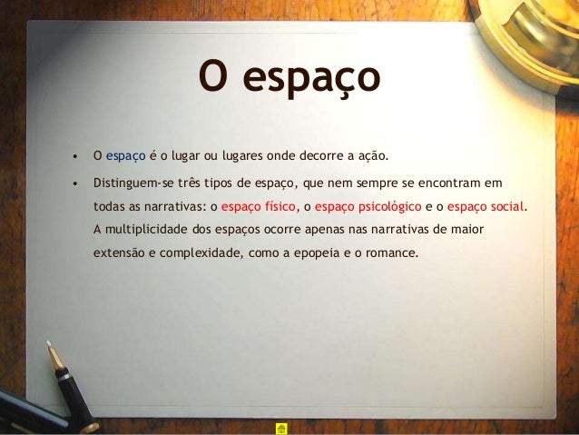 12. 12. O espaço • O espaço é o lugar ou lugares onde decorre a ação. • Distinguem-se três tipos de espaço, que nem sempre se encontram em todas as narrativas: o espaço físico, o espaço psicológico e o espaço social. A multiplicidade dos espaços ocorre apenas nas narrativas de maior extensão e complexidade, como a epopeia e o romance.