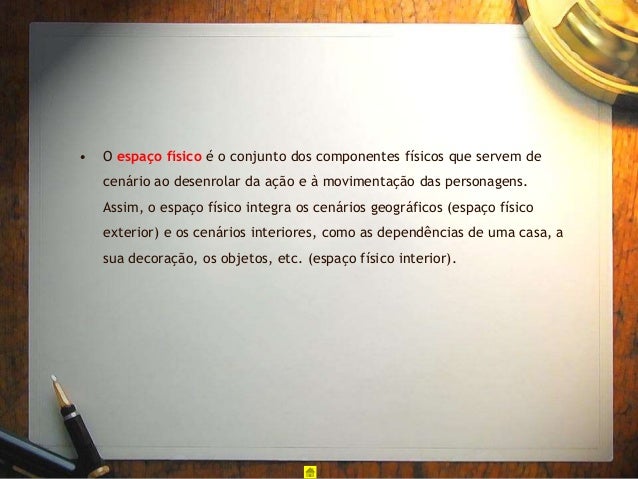 13. 13. • O espaço físico é o conjunto dos componentes físicos que servem de cenário ao desenrolar da ação e à movimentação das personagens. Assim, o espaço físico integra os cenários geográficos (espaço físico exterior) e os cenários interiores, como as dependências de uma casa, a sua decoração, os objetos, etc. (espaço físico interior).